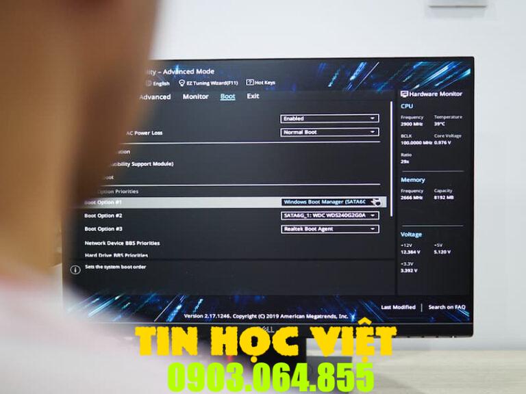 Thay đổi thứ tự khởi động trong BIOS để máy tính khởi động từ USB hoặc DVD.