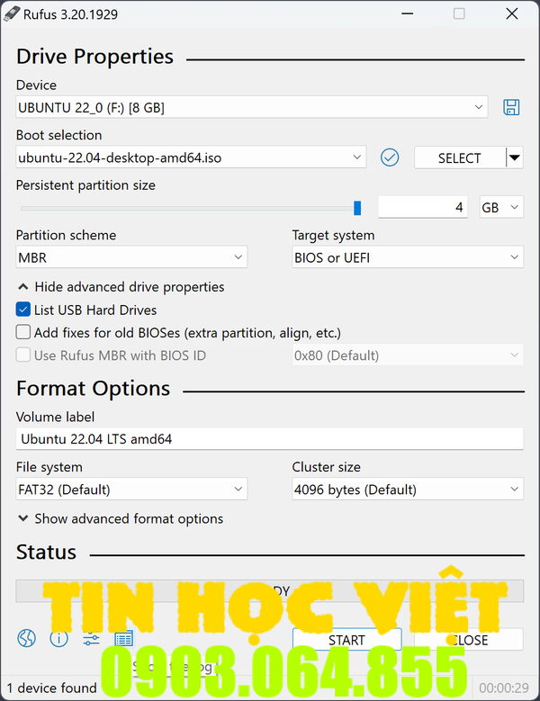 > Nhấp vào nút "START" để bắt đầu quá trình tạo ổ USB khởi động. Rufus sẽ định dạng ổ USB và tạo các tệp cần thiết để cài đặt Windows.